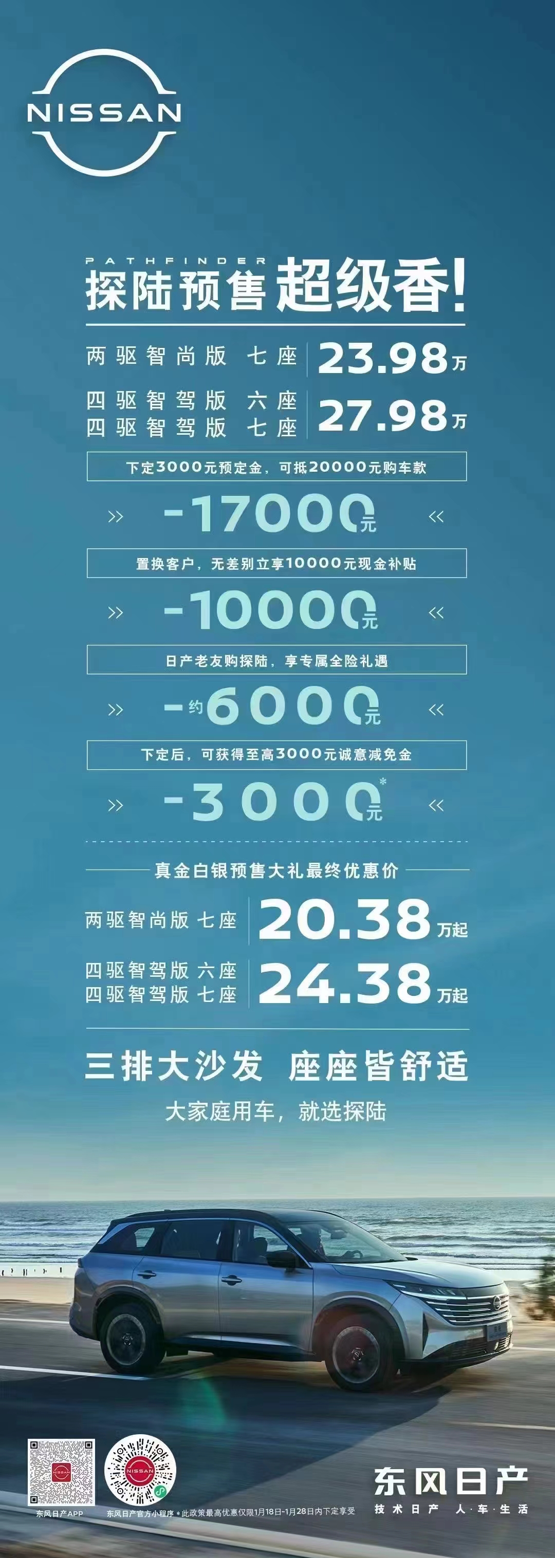 #6座大家庭旗艦SUV #東風日産·探陸_預售開啓 下定立享真金白銀預售大禮 3000元定金至高(gāo)可(kě)抵30000元,10倍大膨脹!日産老友額外贈全險! 大家庭用車,就選探陸! #東風日産彙京昌盛專營店 ☎搶訂熱線:0994-6515555