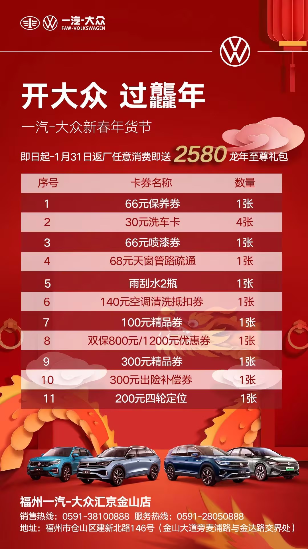 新年(nián)開大衆 福氣帶回家 感恩您一(yī)路的(de)相伴 老車主返廠領2580龍年(nián)至尊禮包 ☎ 詳詢:0591-28050888